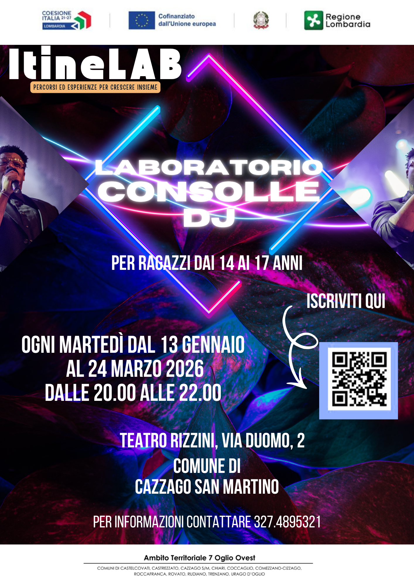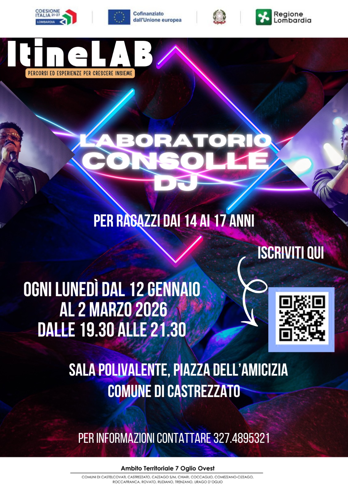 Progetto Itinelab: laboratori gratuiti destinati ai ragazzi dai 14 ai 17 anni dell'ambito Oglio Ovest. In partenza un corso di Consolle Dj a Cazzago San Martino