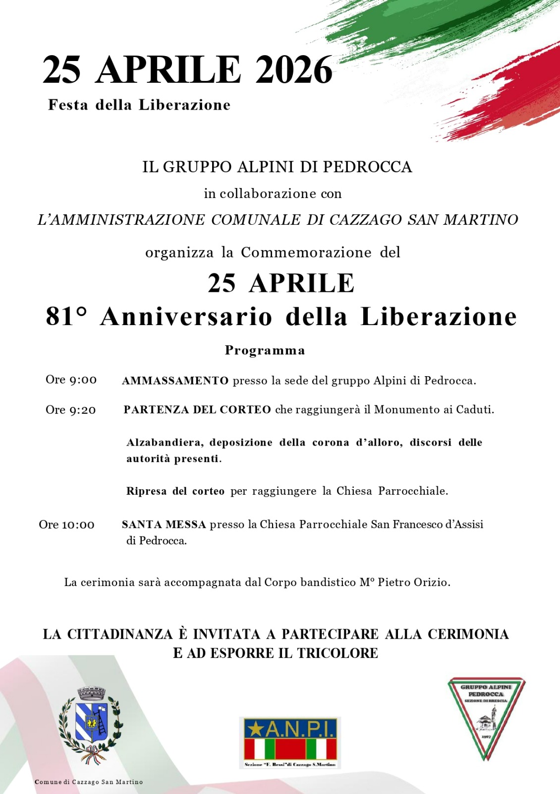 Il gruppo Alpini di Pedrocca, in collaborazione con l'Amministrazione Comunale e il gruppo Anpi sezione "F.Bessi" di Cazzago San Martino, invita la cittadinanza alla cerimonia di commemorazione del 25 Aprile.