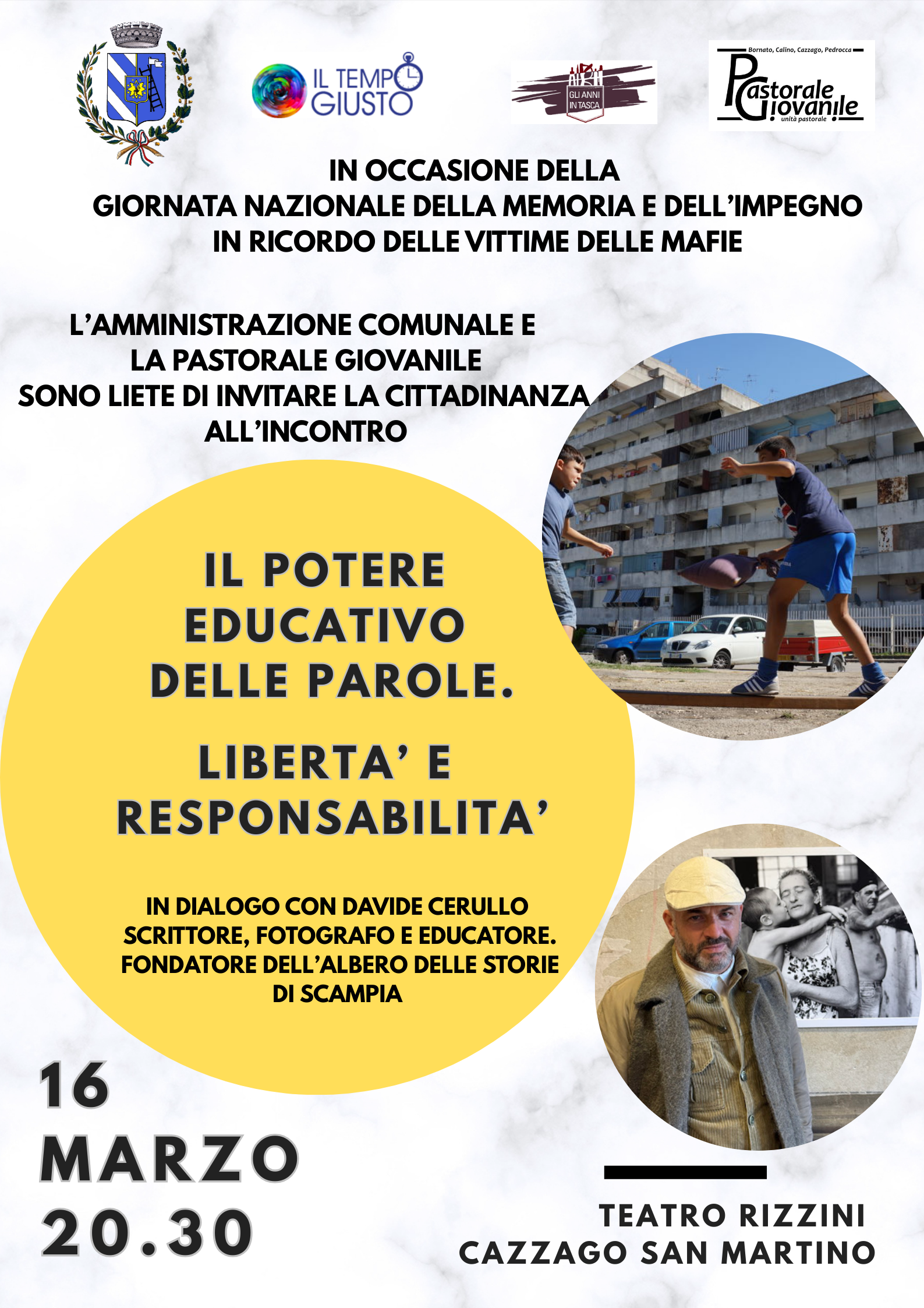 Due serate in dialogo con Davide Cerullo: scrittore, fotografo, educatore, che dopo aver trascorso la sua gioventù nella delinquenza, decide di cambiare vita e di dedicarsi all’arte e all’educazione, in particolar modo a favore dei ragazzi dei quartieri popolari di Napoli. Fondatore dell'Associazione "l'Albero delle storie di Scampia".