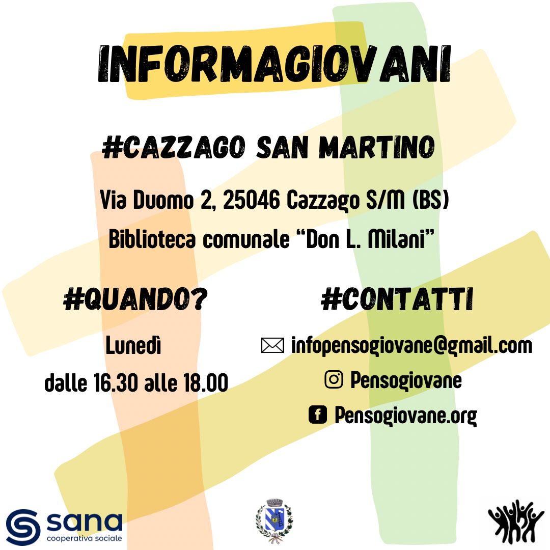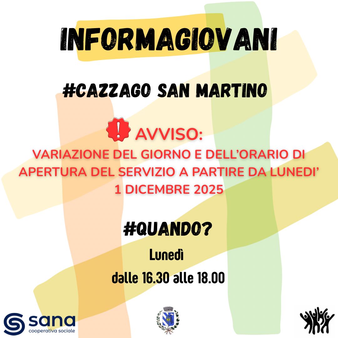 A partire da lunedì 1 dicembre, l'Informagiovani sarà attivo il lunedì pomeriggio, dalle ore 16.30 alle ora 18.00, sempre presso la Biblioteca Comunale di Cazzago.
